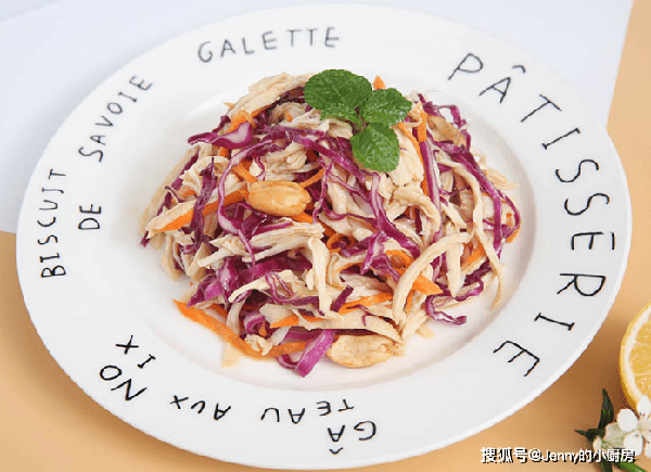 雞胸肉撕成細絲,和紫甘藍、胡蘿卜放在一起,再放入少許鹽、白糖、生抽、檸檬汁、橄欖油攪拌均勻。