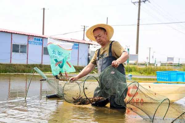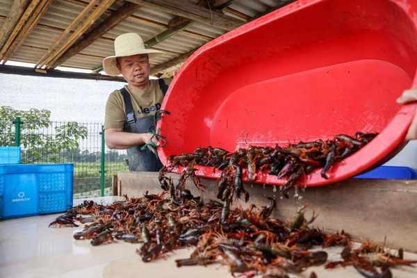 近日,在茶亭鎮大龍村的長沙市榮興農業科技開發有限公司的小龍蝦養殖基地裡,記者看到養殖戶李北興正劃著船,熟練地將地籠內的小龍蝦收入框內。不多時,就裝滿瞭一隻隻活蹦亂跳的小龍蝦。上岸後,按照個頭大小分揀出售。