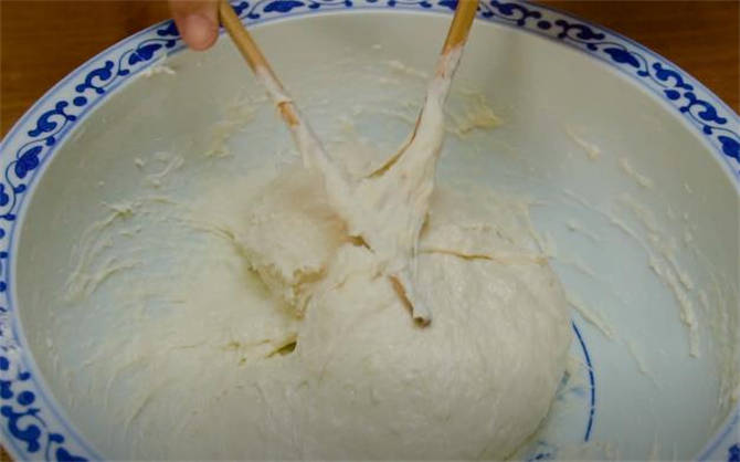 1.首先準備普通面粉250g,酵母粉2g,溫水200到220g和面,面團的含水量比較大,我們的目的是把面粉攪拌成細膩粘稠的面糊,密封溫暖處發酵到兩倍大。