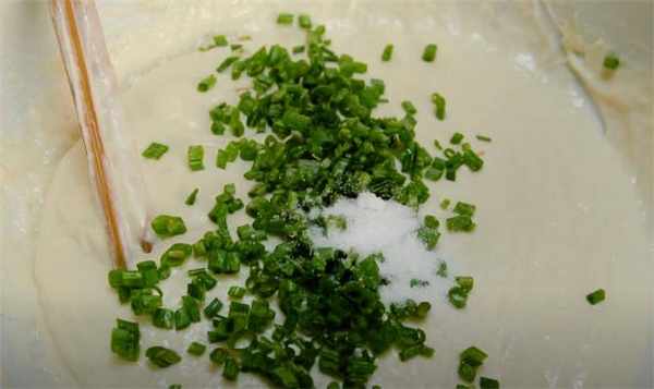 2.面團發好之後先用筷子排氣,把酵母粉發酵過程中產生的氣體排出去,然後加適量的蔥花和鹽調味,用筷子攪勻,這樣基本上就做好瞭。