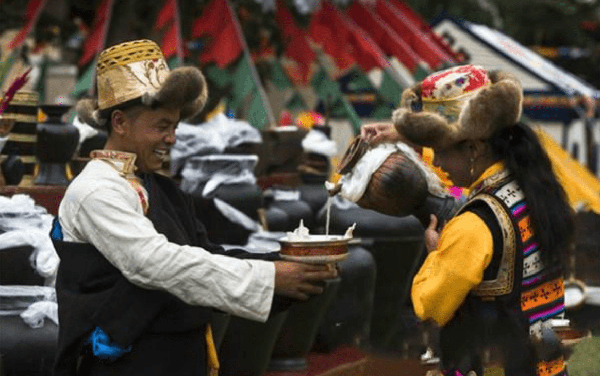 藏族人喝酒,主要表達一種快樂的形式,在他們的酒文化中,沒有“借酒消愁”一說,有些隻是載歌載舞的暢飲。