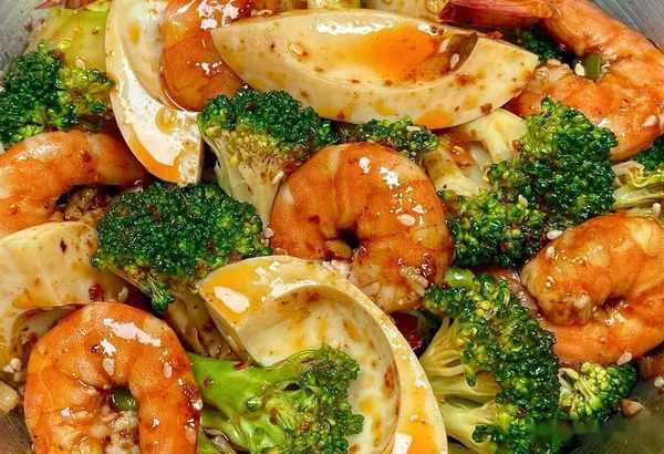 (4)鍋底留油下入蝦仁,小火慢炸至變色,依次下入胡蘿卜、木耳、黃瓜翻炒。