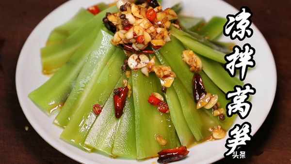 2、起鍋燒水,水開加鹽和油,下去萵筍焯一下,萵筍撈出過涼控幹水分擺盤加入料汁即可。
