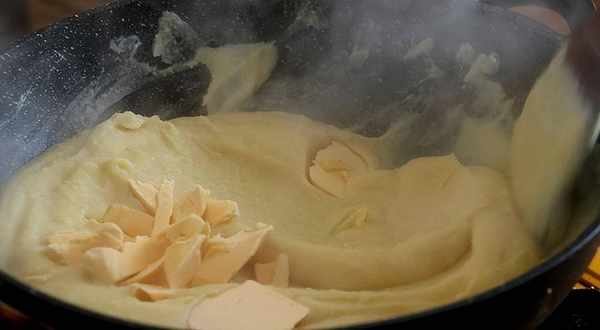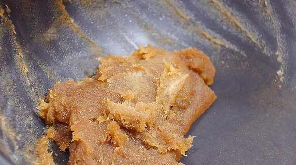 5、 將綠豆沙放在不粘鍋裡面,開中小火,將裡面的水分炒幹,接著加入一些黃油,繼續炒;