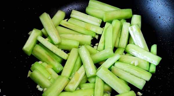 4、 鍋中加入適量的油,油熱將大蒜和小蔥放入進去爆香,然後將絲瓜條放入進去,加入一些鹽調味,炒至出水;