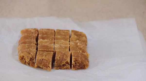 5、 將熬好的薑糖,放在油紙上面,修整一下形狀,晾涼之後就可以切成塊狀。