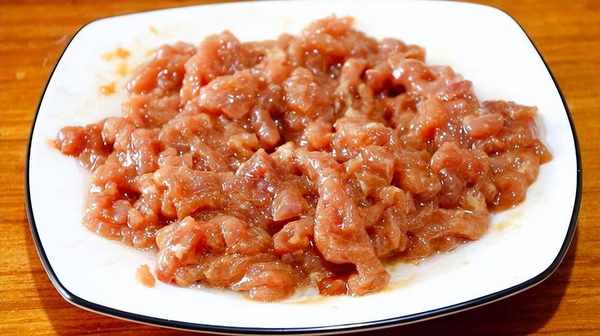 6、 鍋中倒入適量的油,油熱將醃制鍋的肉絲放入進去,炒至變色;