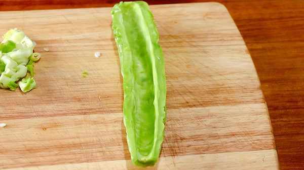 1、 苦瓜清洗幹凈,切去兩頭,然後豎著對半切開,將中間的芯子扣去