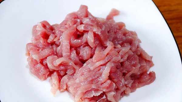 3、 將豬肉沖洗 幹凈,先切成片,再切成細細的絲;