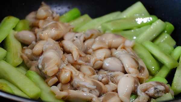 5、 接著將蟶子肉倒入鍋中,翻炒均勻,淋入一些生抽,倒入一些清水,炒勻;