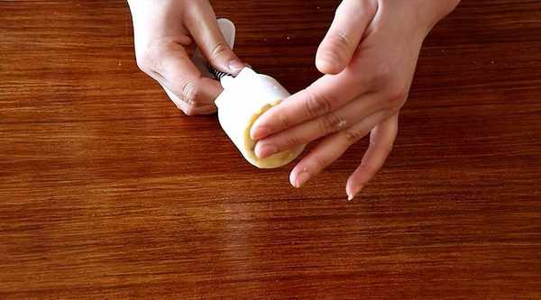 8、 冷卻之後,去一個小劑子放在月餅的模具中,按壓出喜歡的形狀。