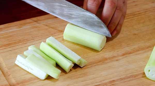 1、 絲瓜清洗幹凈,去兩頭,然後將絲瓜的皮削去,先切成小段,再改到切成小條形;