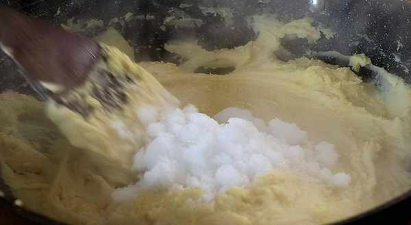 2、 將打好的生薑汁放在鍋中,放入冰糖,開大火熬制;