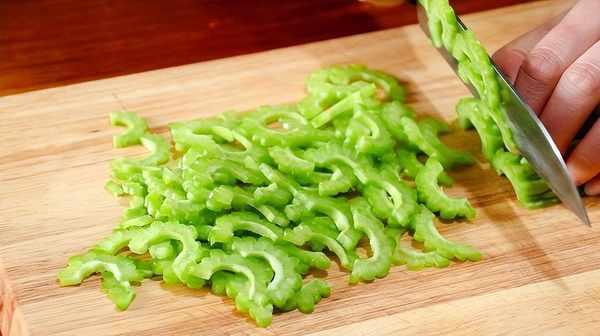 5、 鍋中加水燒開,水開將苦瓜放入進去,焯水10秒鐘,再撈出;