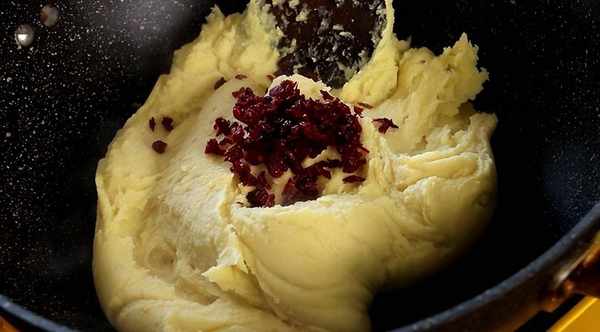7、 之後慢慢炒至不會粘鍋就可以出鍋瞭,將切碎的蔓越莓放入進去,混合均勻;
