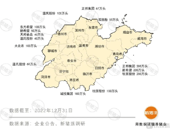 受此影響,牧原股份(002714.SZ)、溫氏股份(300498.SZ)、新希望(000876.SZ)、傲農生物(603363.SH)、*ST正邦(002157.SZ)等上市豬企紛紛來到山東自建或租賃養殖場。據新豬派數據,2019—2021年,溫氏、正邦、新希望等豬企合計在山東佈局生豬項目產能超過1500萬頭。