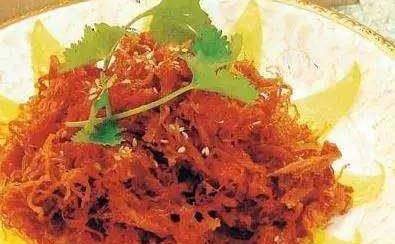 2、鍋放色拉油燒至七成熱,將牛肉絲入油鍋小火炸幹。