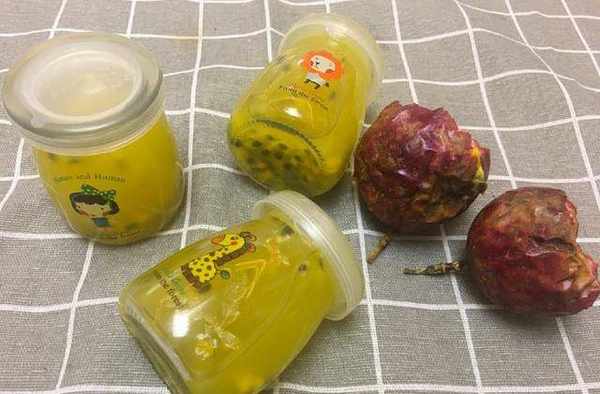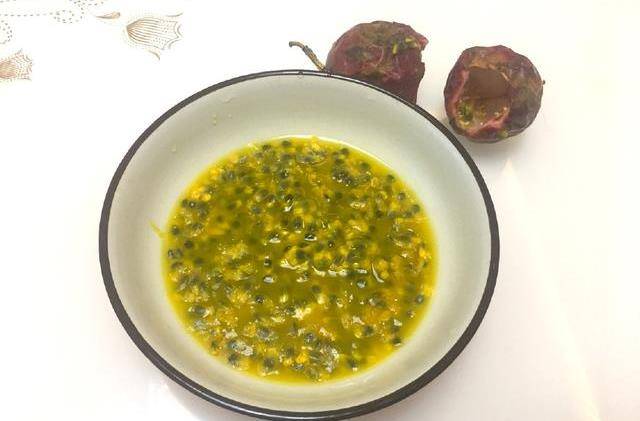 1.準備三到四個百香果,我們北方不產百香果,所以我一直都是在網上買,把百香果切開,然後用勺子挖出裡面的果肉,放到碗中。