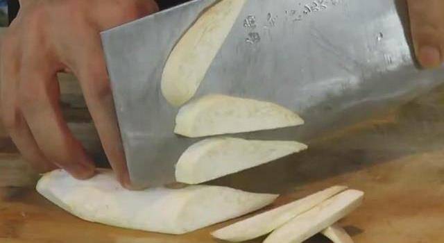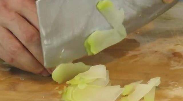 4.榨菜把老的部分去掉,做湯的時候要留意榨菜會一直釋放它的咸度出來,放鹽的時候要註意,切一小塊出來,再切片備用。