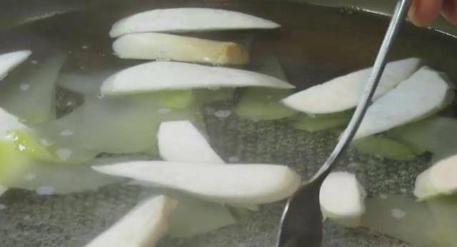 6.熱鍋,加入素高湯,我們就開始來煮這道湯瞭,加入素高湯以後,我們先把杏鮑菇和榨菜放入水裡面去煮,放入少許的鹽巴,放鹽的時候要留意榨菜的咸度。