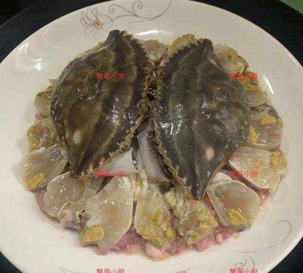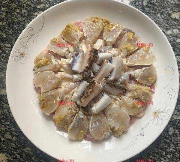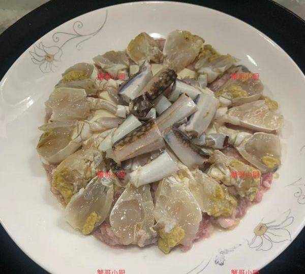 6、然後將梭子蟹一一擺上,註意蟹的刀面要擺在肉末上這樣肉末能吃到蟹的鮮甜味,蟹腳朝內,不懂得看圖
