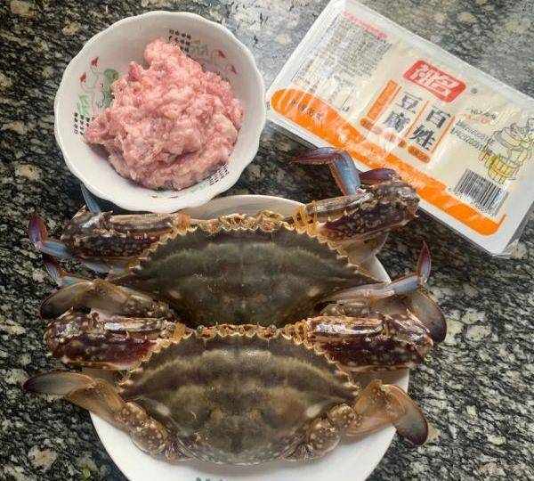 材料:梭子蟹2隻肉末150克內脂豆腐1盒料酒2勺美味鮮2蔥花10克白胡椒粉3克植物油少許