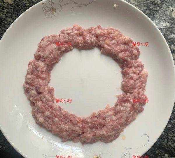 5、用一個大一點的圓盤,在盤中把肉末擺成一個圓圈形狀,註意當中要空的,因為要擺內脂豆腐不懂得看圖