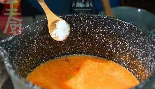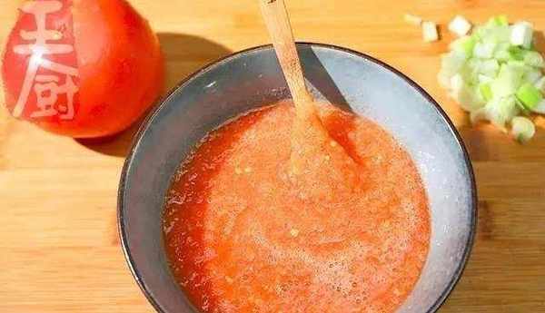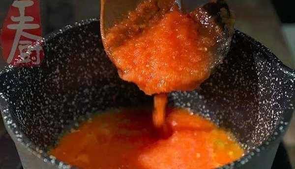5、把西紅柿泥放入鍋中炒2分鐘。