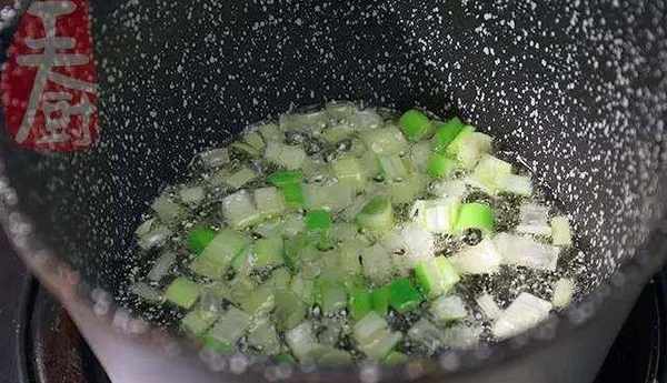 4、炒鍋放少許油加熱,放入蔥花炒香。