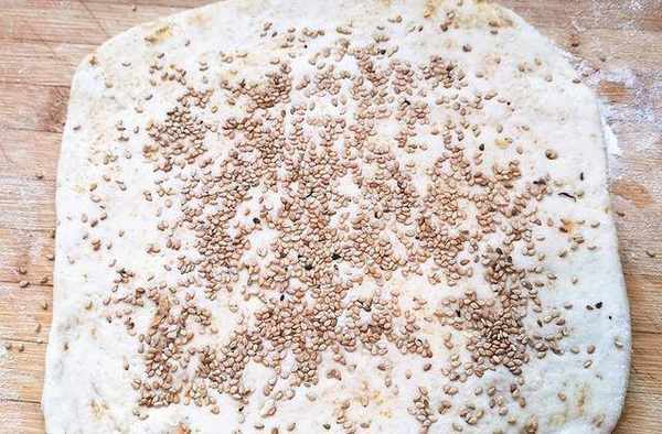 第十一步,餅的表面刷一層水,把白芝麻撒在上面,用搟面杖輕輕搟一下;