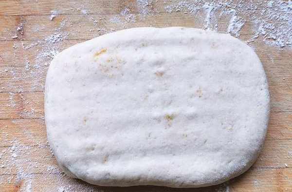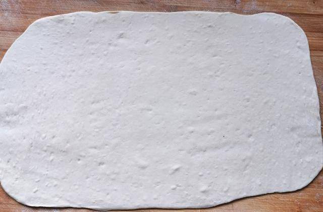 第四步,把面團取出,放案板上,撒些幹面粉,揉揉排氣,用搟面杖搟成長方形面片,厚度在2毫米左右;