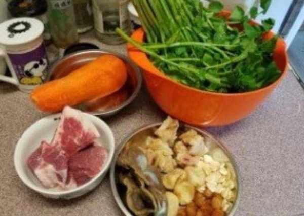 3西洋菜浸水10分鐘,之後洗凈過水兩次栗子、幹鴨腎、南北杏、蜜棗洗凈陳皮浸軟刮去瓤
