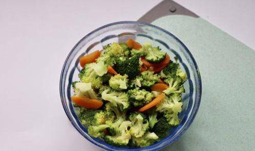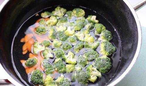 鍋中水燒熱,西蘭花和胡蘿卜放進去煮1分鐘左右即可(煮的時候可以滴幾滴油,顏色更翠綠鮮艷)