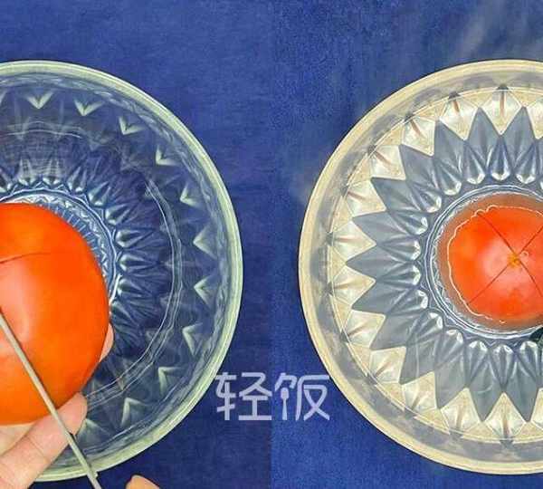第2步、首先將番茄切成十字刀,放在碗中,倒入與番茄齊高的熱水,泡一會兒,再將熱水倒掉。