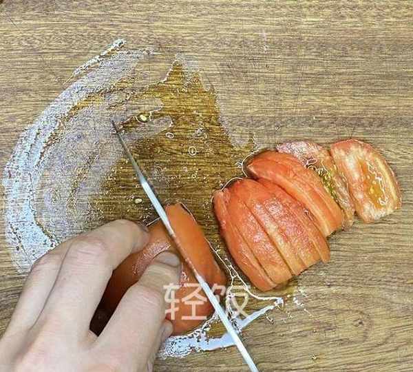 第3步、將番茄的皮剝掉,這樣可以使口感更好。然後將番茄切切成小片,放在旁邊備用。