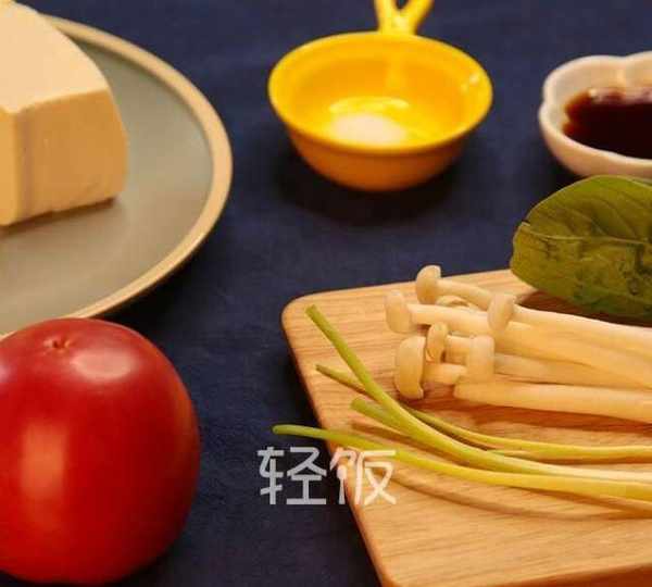 原料:番茄、蟹味菇、嫩豆腐、冬瓜、小白菜、食用油、蔥花、生抽、鹽。