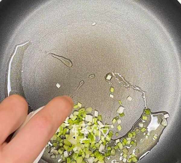 第4步、鍋中倒入15ml的食用油,將10克的蔥花倒入鍋中,爆炒出香味。