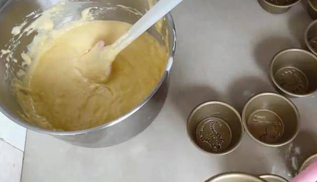 扒在大湖裡面,塞入210克低筋面粉,然後用刮刀上下翻拌均勻,不要轉圈,攪拌時間不要太長,以免消泡。面糊翻拌均勻以後拿模具刷上油,攪拌好的面糊到8分,