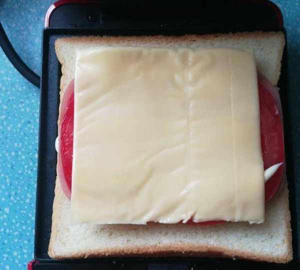 第10步、放上芝士,雞蛋。(少拍瞭一個步驟)再蓋上一片吐司。打開早餐機開關。