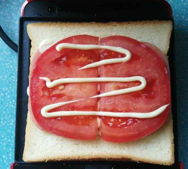 第9步、西紅柿放上,擠上一點沙拉醬。