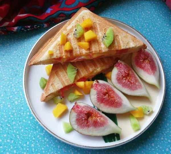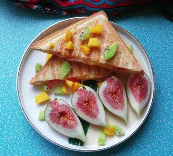 原料:西紅柿、火腿、柴雞蛋、芝士、吐司、沙拉醬、無花果。