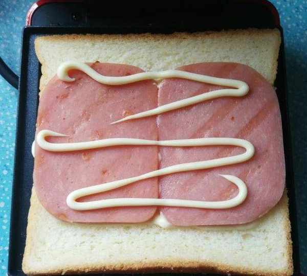 第8步、煎過的火腿放上,再擠上一點沙拉醬。