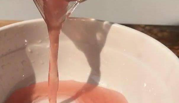 我們來準備50克的白涼粉,碗中倒入150毫升榨西紅柿汁,往西紅柿汁中加入剛準備好的白涼粉,記住勺子攪拌時,一定要攪拌至涼粉完全融化,在另一個碗中倒入250毫升的西紅柿汁,加4勺的白糖,喜歡甜一點的可以多加一些白糖。