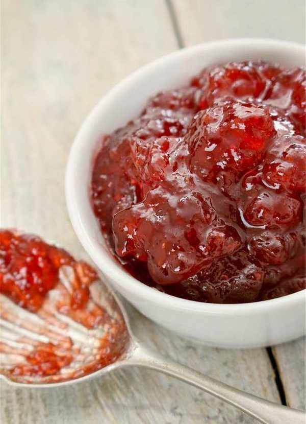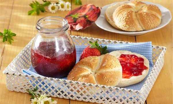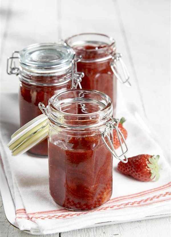 5分鐘後變得更加濃稠瞭,關火出鍋,不是特別燙的時候裝進密封罐裡,罐子一定要提前用開水燙一下消毒,我們的草莓醬就做好瞭,早餐的時候挖一勺抹在面包上,再蓋上一片面包就可以瞭。面包松軟細膩,