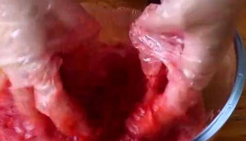 戴上一次性手套下手捏碎。恒傑也可以用破壁機或者榨汁機打碎,像這樣捏得碎碎的就可以瞭。醃制30分鐘讓果膠析出,準備半個檸檬擠出裡面的汁,