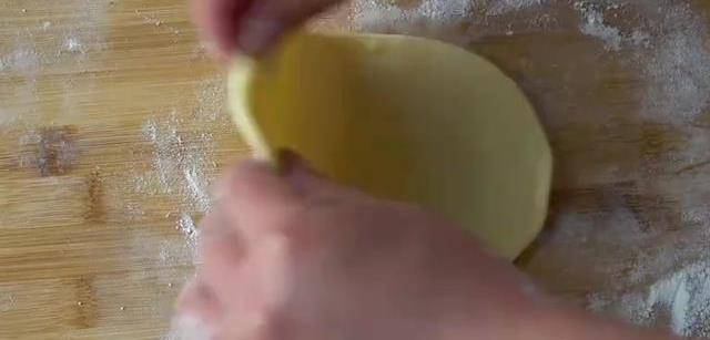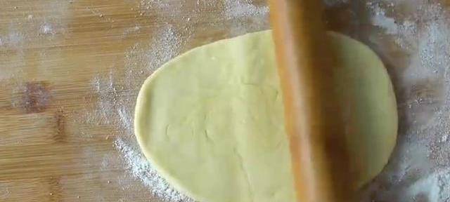 然後按壓一下,小餅就出來瞭,全部做好後再來搟開,先搟成牛舌狀後對折,繼續對折,小三角形就出來瞭,小燒餅生胚就做好瞭。平底鍋刷油放入面餅,表面再刷一層油,蓋上蓋子,用小火烙,一面定型翻另一面。