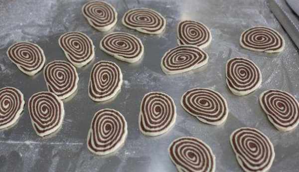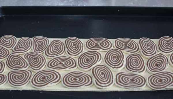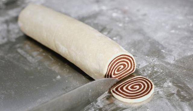 10、冷凍松弛好的圓柱面團切成5毫米厚的圓形片。