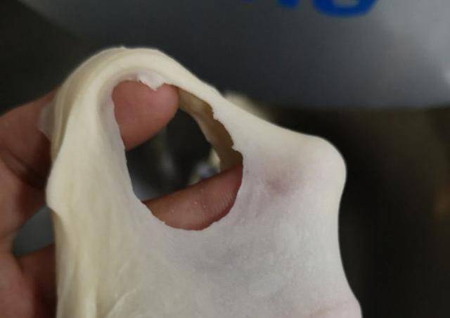 1、所有原材料混合打出出8成筋,破洞鋸齒狀