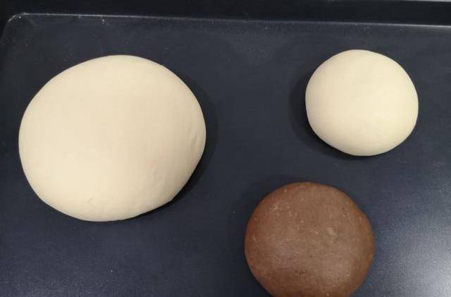 3、分割面團分成三份,分別1000克,360克,360克,其其中一個360克的面團混入9克可可粉和9克水