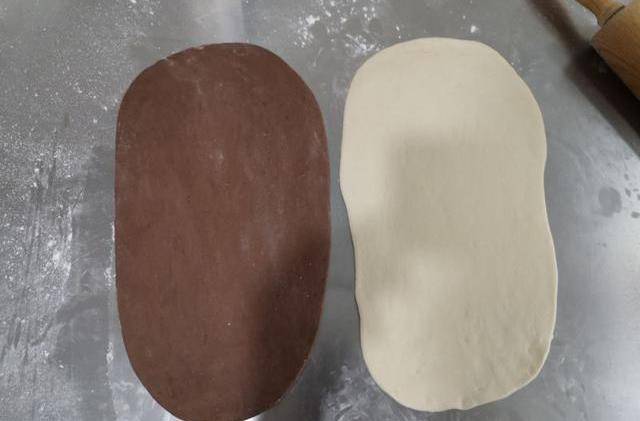 7、將360克的白色面團和360克的可可面團分別搟長。